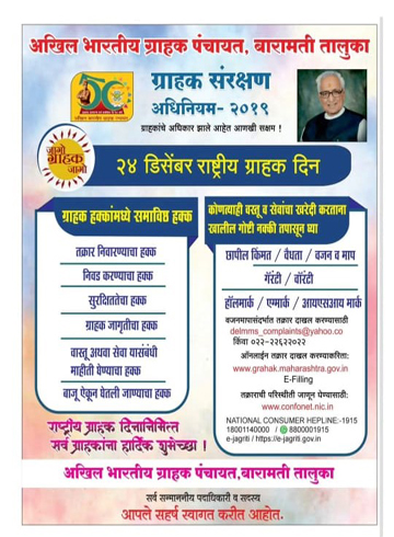 २४ डिसेंबर रोजी साजरा होणाऱ्या राष्ट्रीय ग्राहक दिनाचे औचित्य साधून अखिल भारतीय ग्राहक पंचायत, बारामती तालुका यांच्या वतीने ग्राहक जनजागृतीसाठी विशेष मार्गदर्शन कार्यक्रमाचे आयोजन करण्यात आले. यावर्षीची थीम “Efficient and Speedy Disposal Through Digital Justice” अशी असून “जागो ग्राहक जागो” व “ग्राहक एवं राजा” या संदेशांतून ग्राहक हक्कांबाबत जनजागृती करण्यात आली.
