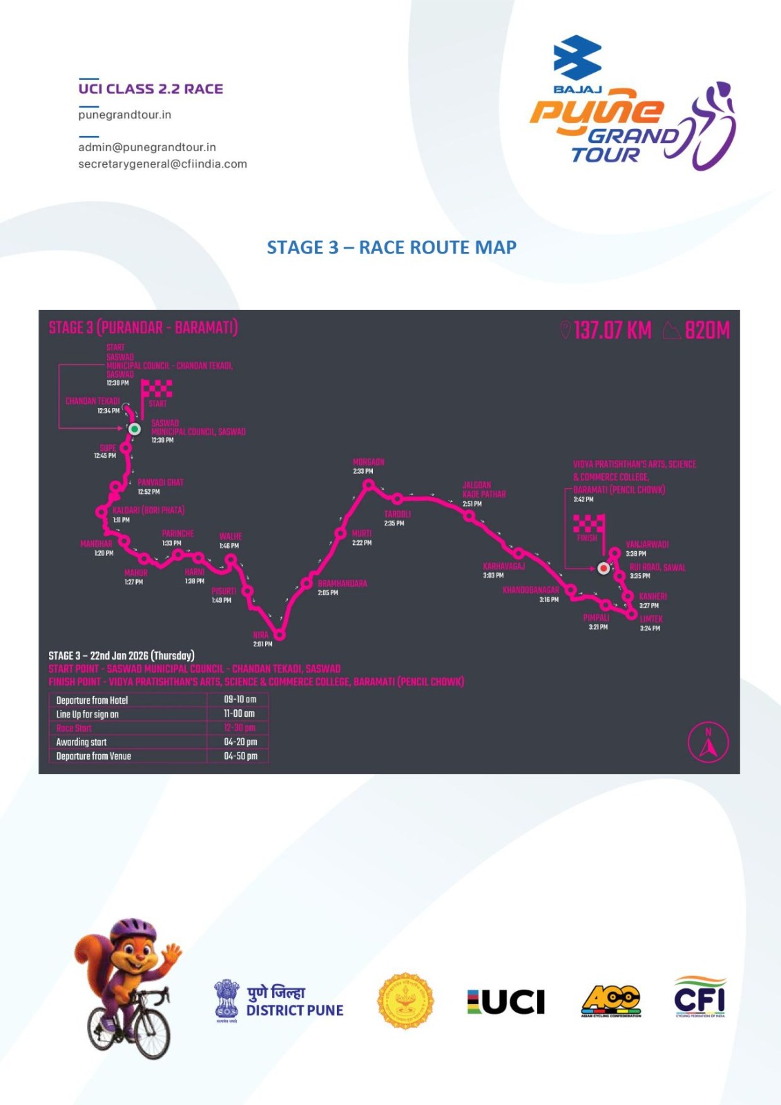 ‘बजाज पुणे ग्रँड टूर–२०२६’ या आंतरराष्ट्रीय दर्जाच्या सायकल स्पर्धेअंतर्गत तिसऱ्या टप्प्याचे आयोजन गुरुवार, दि. २२ जानेवारी २०२६ रोजी सासवड ते बारामती दरम्यान करण्यात आले आहे. या टप्प्याची सुरुवात दुपारी १२.३० वाजता सासवड येथील नगरपरिषद, चंदन टेकडी येथून होणार असून बारामती येथील विद्या प्रतिष्ठान कला, विज्ञान आणि वाणिज्य महाविद्यालय येथे या टप्प्याचा समारोप होणार आहे.