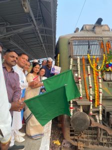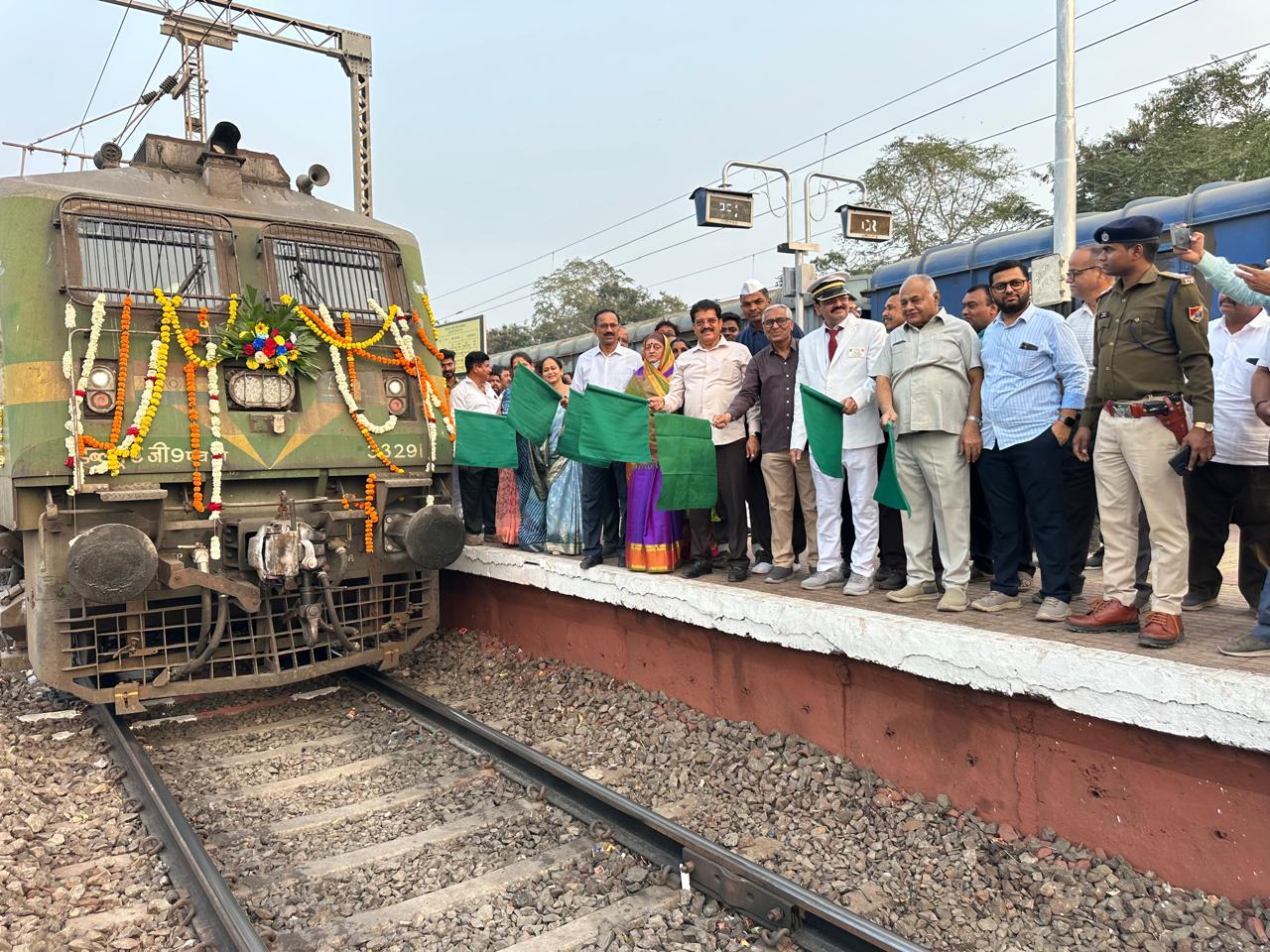 भुसावळ रेल्वे स्टेशनवर नामदार मंत्री संजय जी सावकारे यांच्या सौभाग्यवती रजणी ताई सावकारे, श्री. पुनित अग्रवाल DRM साहेब , भालेराव साहेब स्टेशन ईंचार्ज, भुसावळ शाखेचे मुखी सुरेश जी , संचालक रतन परदेशी जी, आबा पाटील यांनी गाडीस हिरवी झेंडी दिली.